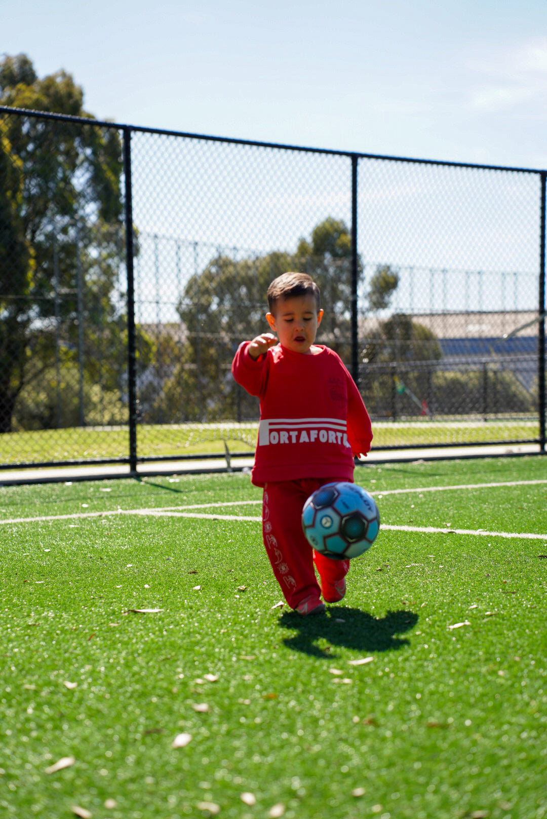 In bold red with crisp white stripes, this lightweight transeasonal designed with dropped shoulders for a relaxed fit and features a ribbed neck, sleeve cuffs and relaxed bottom hem. Channelling 90s athletic energy while reimagining it for today. The statement PORTAFORTUNA (Lucky Charm in Italian) across the front makes it a standout piece, honouring the magic of childhood and the belief that our bambini bring luck wherever they go.