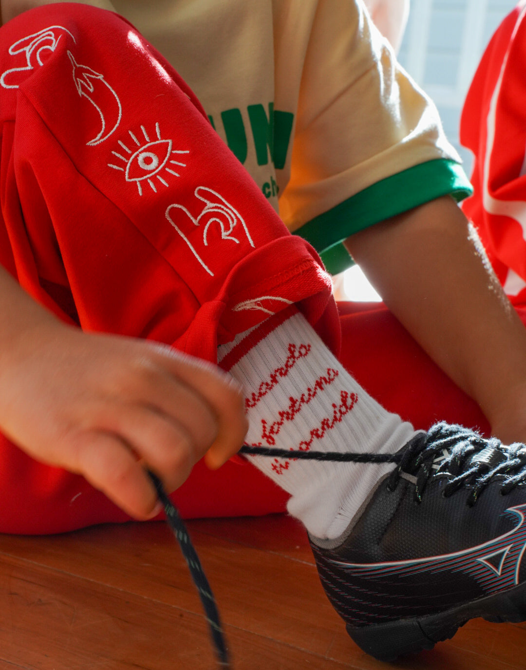 The Amulet Pants in Ferrari red celebrate the timeless Italian belief in symbols of luck and protection. Inspired by 90s World Cup sportswear, they’re crafted in a luxe transeasonal weight with embroidered charms running down the sides—each one a little guardian of good fortune.